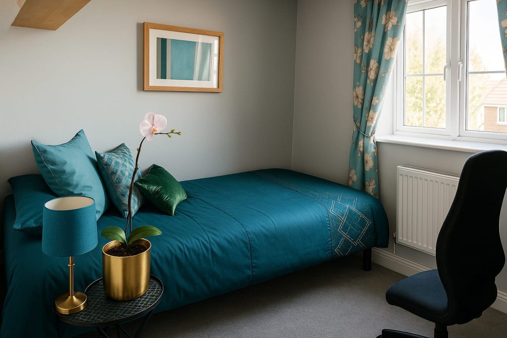 After relocating to Wiltshire, the client wanted a versatile space serving as both a single bedroom and a cosy study. The design combines a harmonious colour palette, layered textures, and botanical accents to create a quietly luxurious, deeply personal environment.